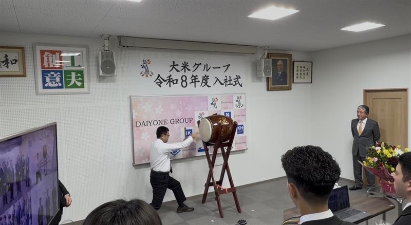 式の後半には総務部副部長 福里誠より新入社員歓迎の祝い太鼓のもと、全社員心を一つにし、新年度をスタートしました。