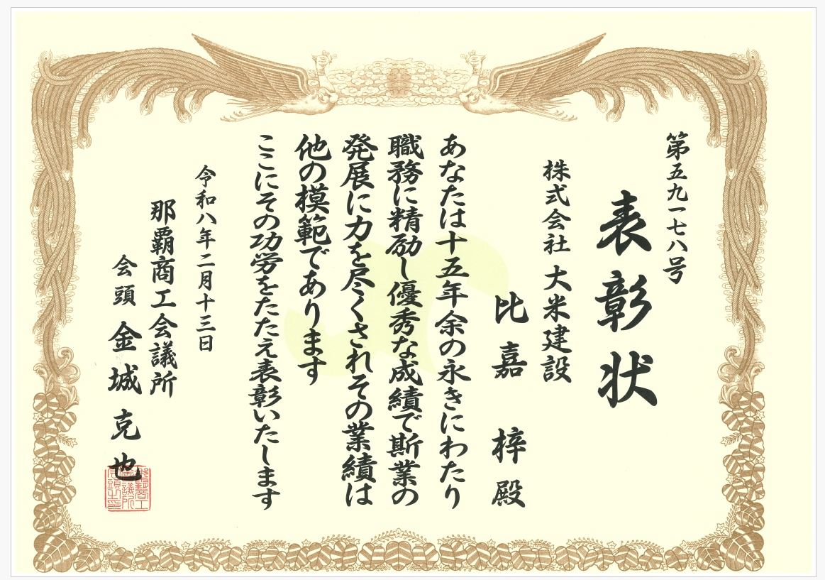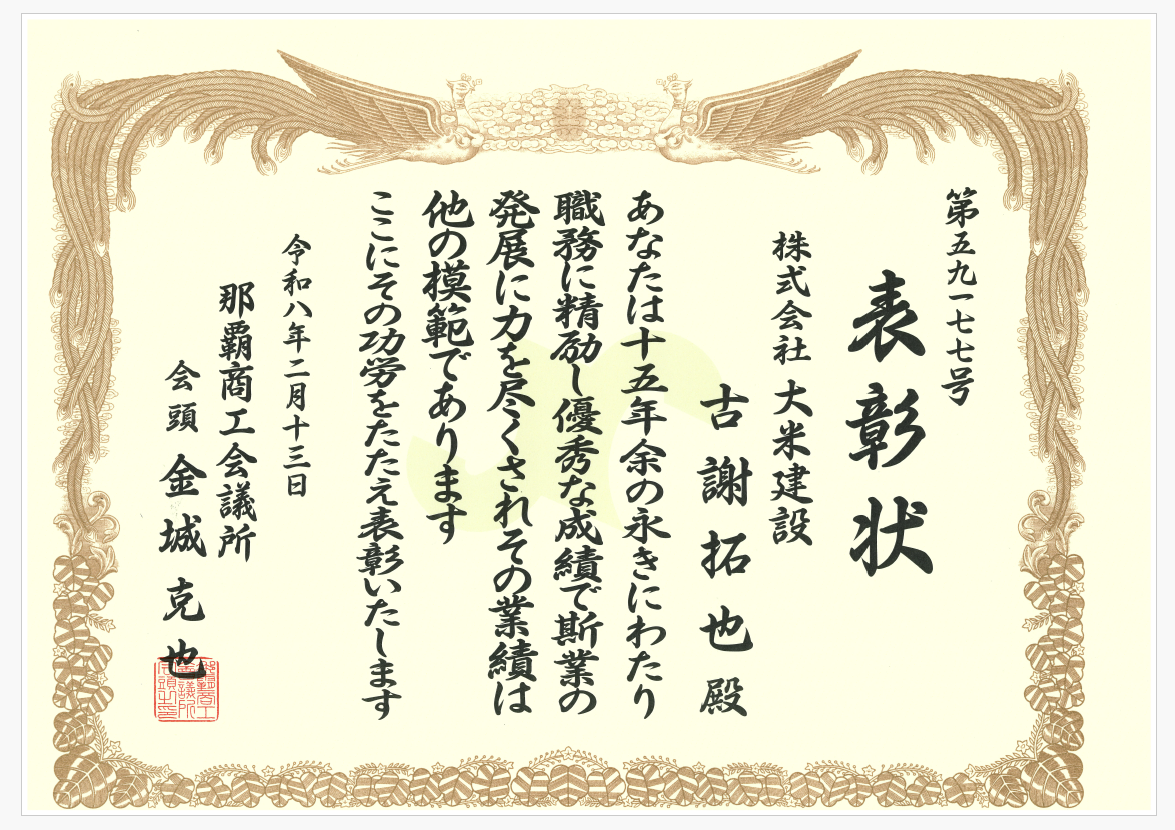 弊社からは、総務部 総務課 係長 古謝 拓也および総務部 経理課 比嘉 梓の2名が受賞いたしました。本表彰は、勤続15年以上にわたり日常業務に精励し、その功績が特に優秀である社員に対して贈られるものになります。